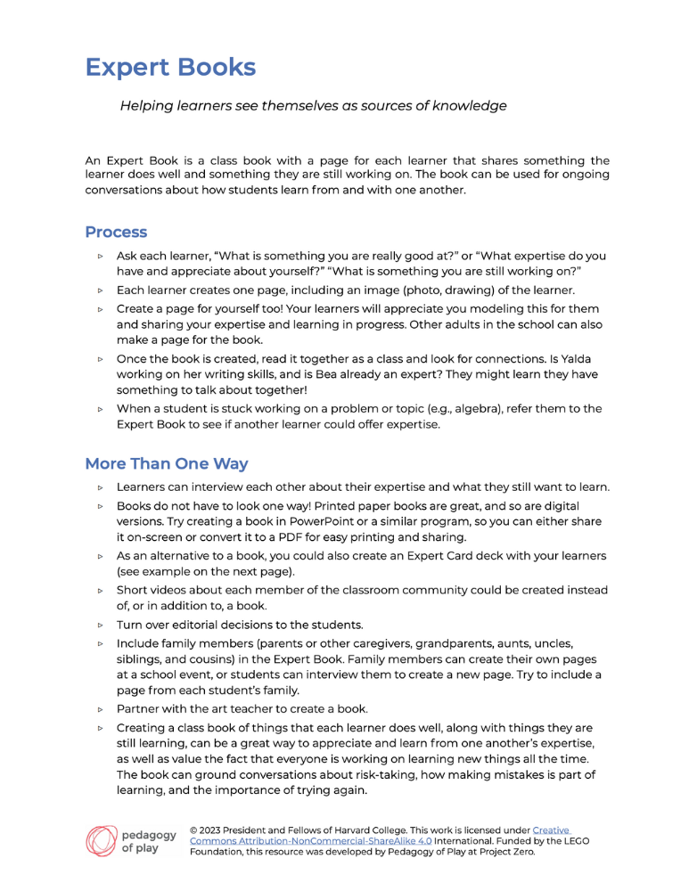 An Expert Book is a class book with a page for each learner that shares something the learner does well and something they are still working on. The book can be used for ongoing conversations about how students learn from and with one another.