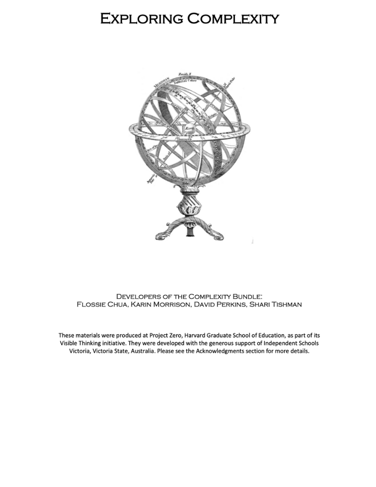 Exploring Complexity features tools and strategies for supporting learners to enter and investigate the complexity of ideas, objects and systems from a variety of vantage points. Exploring complexity involves identifying multiple and often competing perspectives, looking closely at interacting factors, recognizing conflicting values and forces, and appreciating issues of power, truth, and leadership. The outcome of such an inquiry is a deeper understanding of the anatomy of the object, issue, or idea under study – an understanding of its parts, its dimensions, its tensions, its uncertainties.