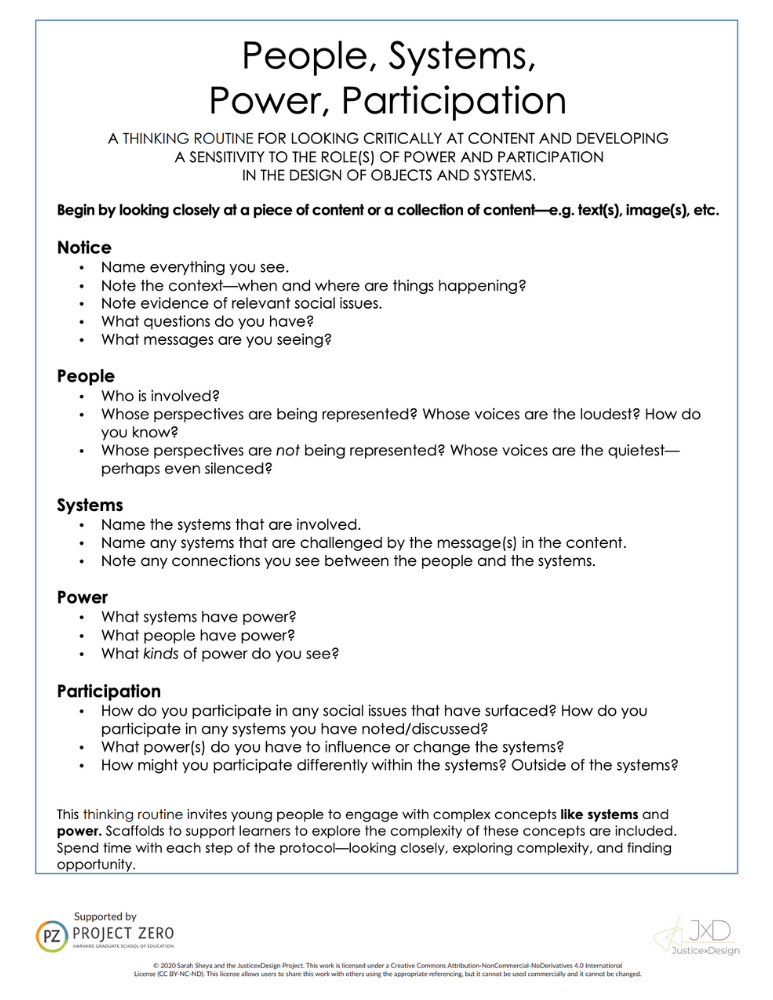 A thinking routine for looking critically at content and developing sensitivity to the roles of power and participation in the design of objects and systems.