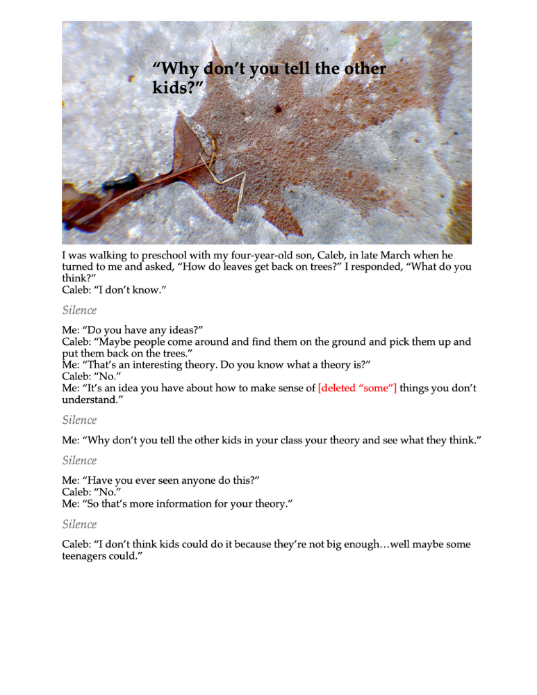 A short essay by Krechevsky about how Reggio Emilia ideas influenced her parenting See other tools for engaging families in this work on pp.151-162 in the Visible Learners: Promoting Reggio-Inspired Practices in All Schools book.