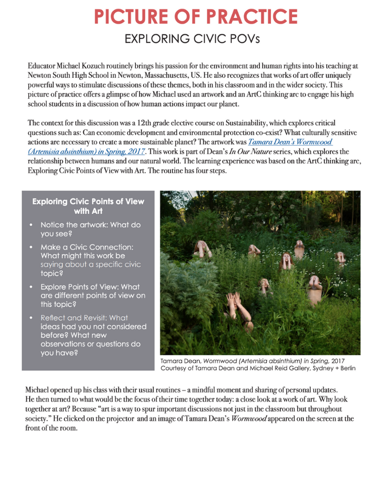 This picture of practice documents how a high school sustainability teacher used an artwork and the ArtC thinking arc Exploring Civic Points of View with Art to engage students in examining human impacts on the natural world. Through a carefully structured sequence of close observation, civic connection making, perspective exploration, and reflection, students analyzed Tamara Dean’s Wormwood to surface diverse interpretations about environmental responsibility, denial, cultural values, and accountability. The routine supported students in slowing down their thinking, listening to multiple viewpoints, and revisiting their assumptions. The experience illustrates how art-based inquiry can foster deep discussion of complex civic and environmental issues while strengthening students’ capacity for perspective taking and reflective judgment.