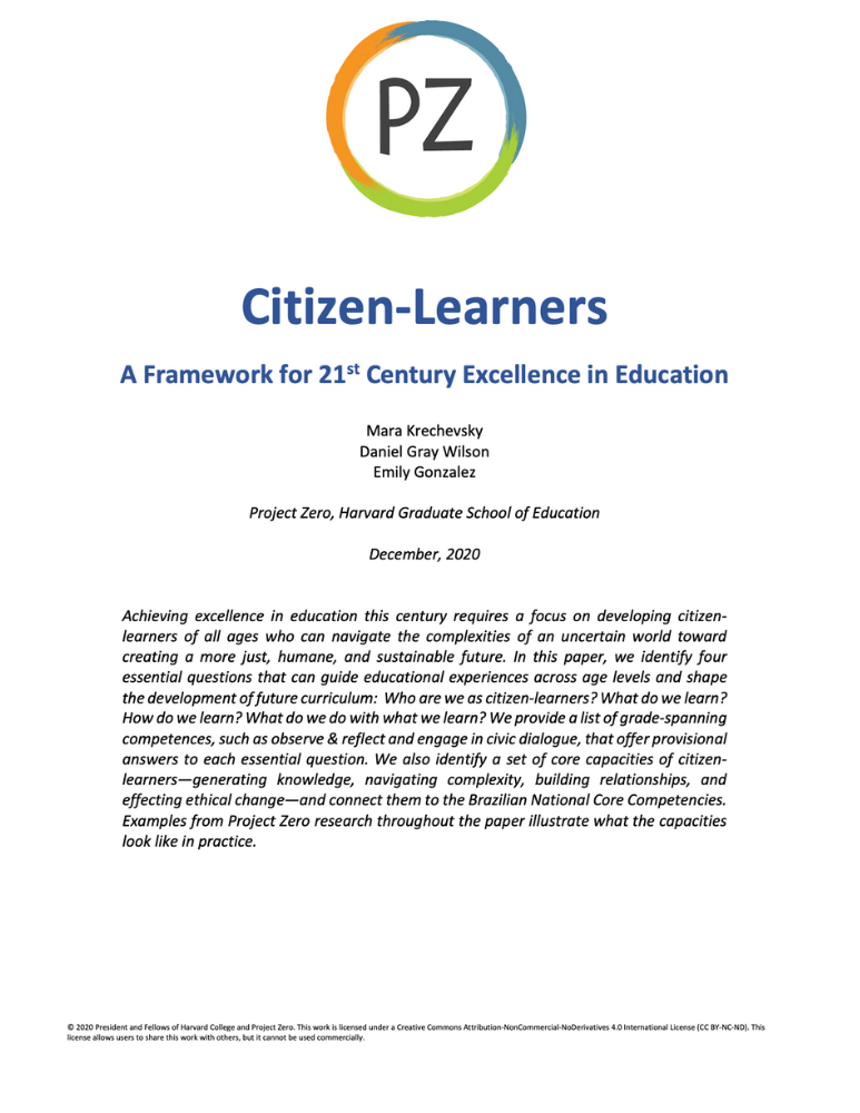 Excellence in education extends beyond high quality curriculum to include ethical structures, meaningful learning experiences, and responsible role models. This white paper proposes reframing the purpose of schooling around the cultivation of citizen learners who engage with complexity, contribute to their communities, and take thoughtful action on issues of shared concern. Informed by over fifty years of Project Zero research, the framework identifies core capacities and guiding questions, connects them to Brazil’s National Core Competencies, and illustrates their application through classroom examples.