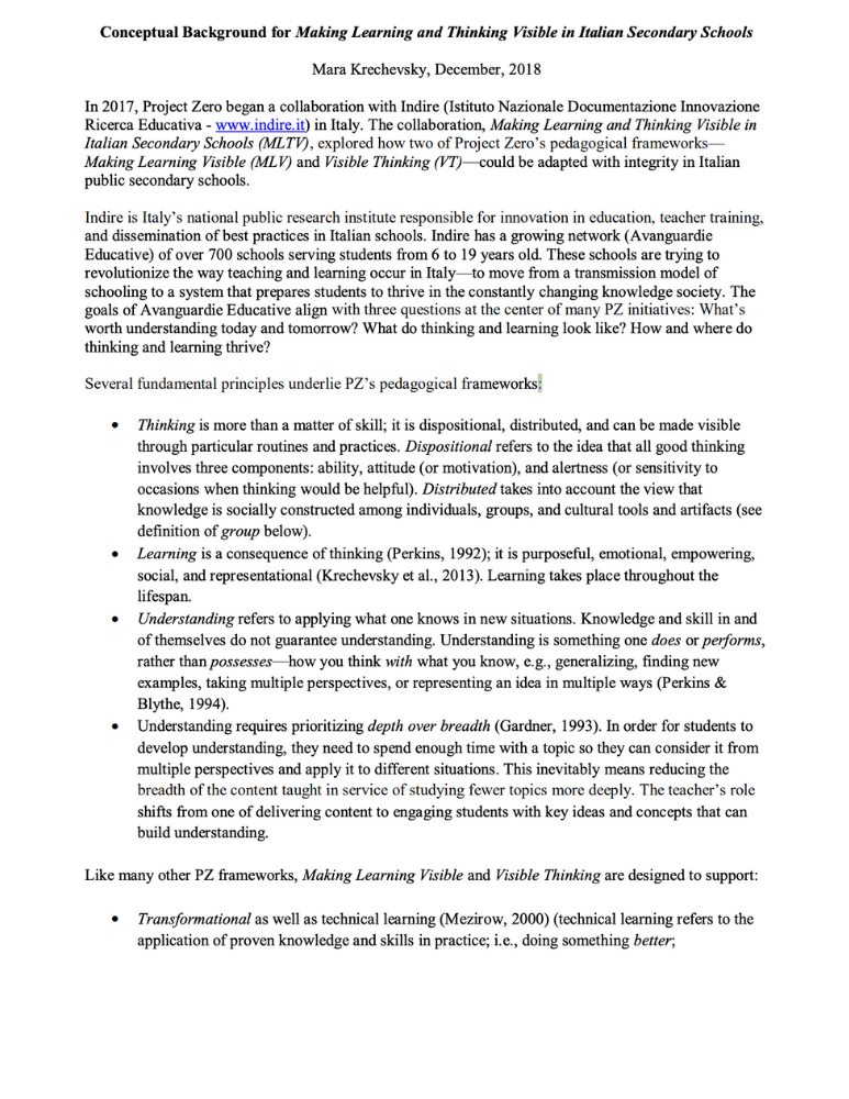 In 2017, Project Zero began a collaboration with Indire (Istituto Nazionale Documentazione Innovazione Ricerca Educativa - www.indire.it) in Italy. The collaboration, Making Learning and Thinking Visible in Italian Secondary Schools (MLTV), explored how two of Project Zero’s pedagogical frameworks—Making Learning Visible (MLV) and Visible Thinking (VT)—could be adapted with integrity in Italian public secondary schools.