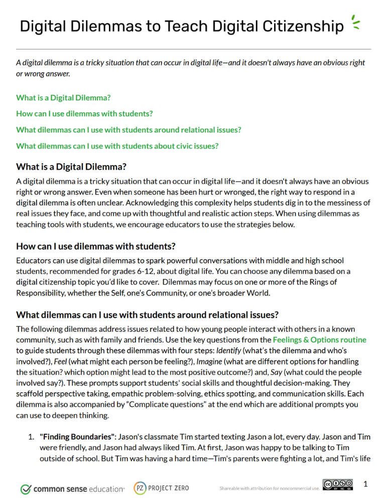 Young people are constantly navigating digital dilemmas, which don't always have right or wrong answers. How much connection is too much? What does it mean to be a good friend in a social media world? How should they respond to online hate speech? Based on research by Carrie James and Emily Weinstein at Project Zero at the Harvard Graduate School of Education, the middle and high school Digital Citizenship Curriculum includes digital dilemmas and thinking routines. Educators can use these resources to help students develop skills and dispositions to respond to real-world dilemmas in thoughtful, effective, and empathetic ways.