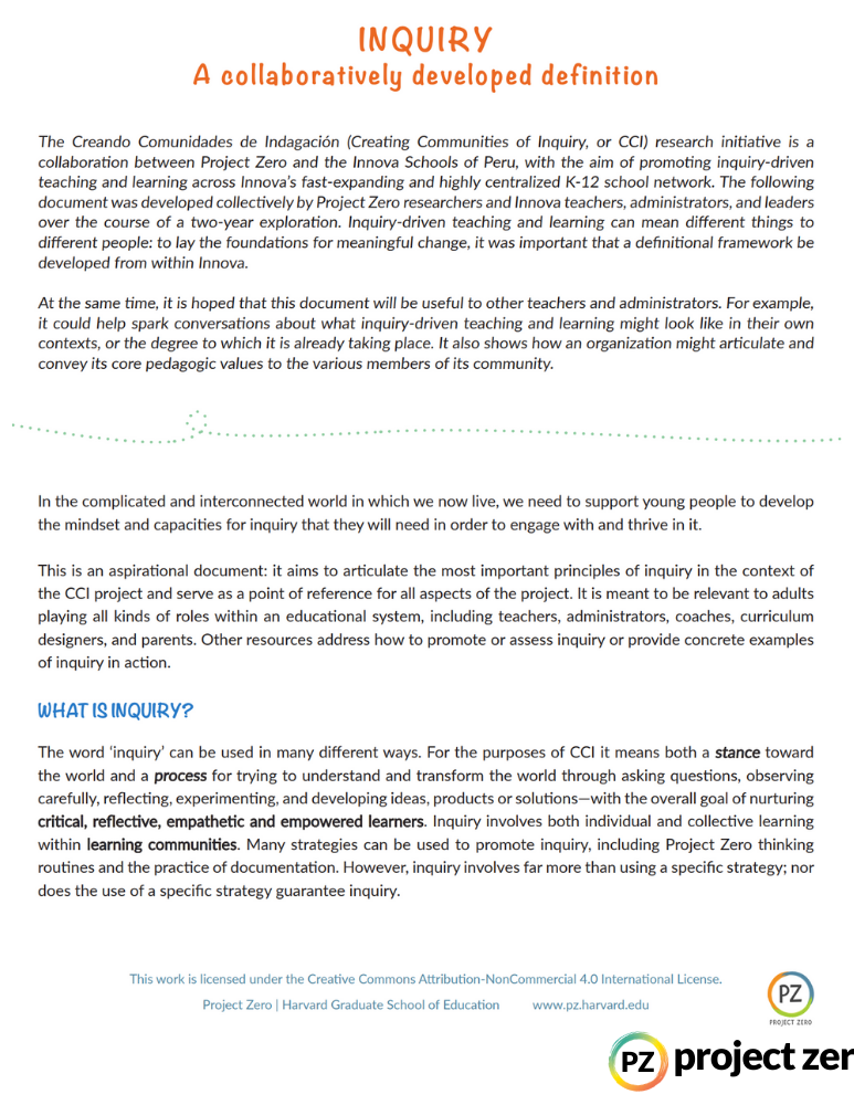 The Creando Comunidades de Indagación (Creating Communities of Inquiry) Framework for Inquiry is a definitional framework that can support teachers, educational administrators, and other stakeholders in considering and discussing the role of inquiry-driven teaching and learning in a given context.