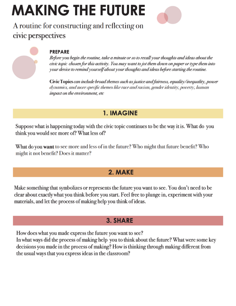 Making the Future is a thinking routine designed to help learners explore civic topics by imagining possible futures and expressing their ideas through making. The routine guides participants through three phases: imagining how current conditions might continue and what futures they would prefer, creating a symbolic representation of a desired future, and sharing reflections on both the product and the process. By encouraging thinking through making, the routine supports learners in clarifying values, examining who benefits or is harmed by different futures, and articulating civic perspectives in ways that extend beyond verbal discussion. Designed for flexible use across classrooms and learning settings, the routine emphasizes process over product and supports thoughtful engagement with complex civic issues.