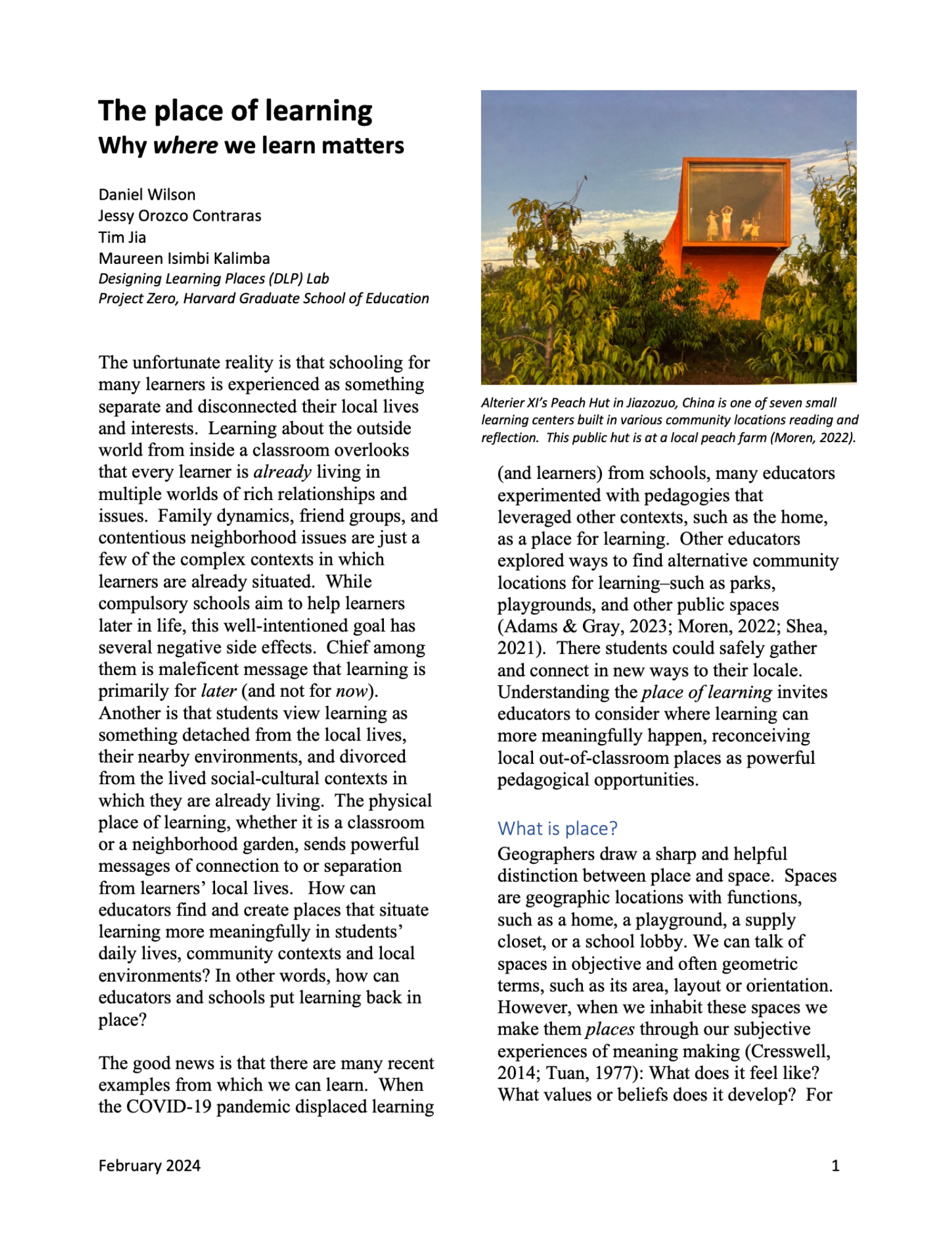 The Place of Learning examines why the physical and social contexts of learning profoundly influence how students engage, connect, and make meaning. Drawing from research in geography, environmental psychology, and education, the authors distinguish between space—a physical location—and place—a space imbued with meaning through lived experience. They argue that learning environments too often disconnect students from their immediate lives, communities, and ecosystems, reinforcing the notion that education is preparation for “later” rather than meaningful “now.”