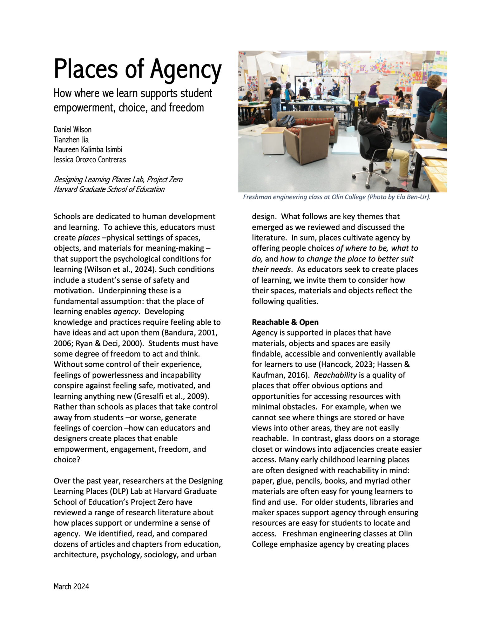 Places of Agency explores how the physical design of learning environments shapes students’ sense of empowerment, motivation, and freedom. Drawing on research from education, psychology, architecture, and urban design, the authors argue that meaningful learning depends not only on pedagogy but also on the qualities of the spaces where learning occurs. The paper identifies three central qualities of “places of agency”: reachable and open, movable and flexible, and varied and adjustable.