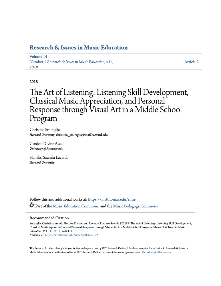 Although many programs aim to develop students’ listening skills and promote the appreciation of Western classical music, relatively few such programs incorporate visual art. This study examined the perceived effectiveness of the Edinburgh International Festival’s (EIF) Art of Listening program in reaching its stated goals to: develop skills for listening, encourage the enjoyment of listening to Western classical music, break down preconceptions held about Western classical music, cultivate a deeper relationship with the imagination through music and art, and encourage students’ personal responses to music. Focusing primarily on the first three goals, this study gathered data from 78 students from six upper primary classes (generally students ages 11 or 12) from four schools located in the Edinburgh, Scotland metropolitan area. Findings from student and teacher surveys before and after the program as well as program observations indicate that participants perceive that the Art of Listening program achieves the specific objectives examined, at least in the short-term. Both students and teachers responded positively to the program’s unique combination of listening skill development, classical music appreciation, and responses to music through visual art. The article discusses considerations for implementing similar programs in other contexts and makes suggestions for future research.