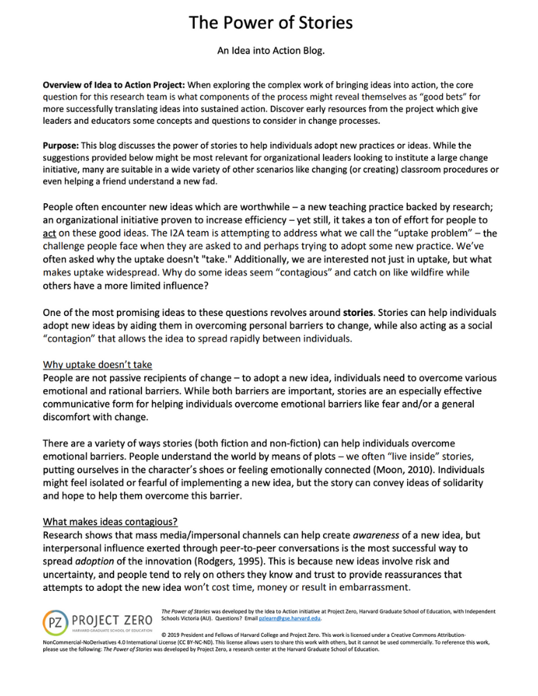 This piece, part of Project Zero’s Idea to Action initiative, examines why promising ideas often fail to turn into sustained action and explores how stories can help address this “uptake problem.” Even when individuals see the value of a new practice, research shows that emotional barriers such as fear, discomfort, or uncertainty often hinder adoption. Stories can help people overcome these obstacles by offering relatable narratives that provide hope, solidarity, and a sense of connection.