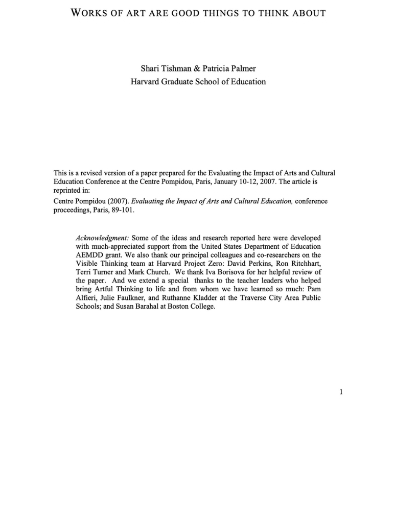 This article provides highlights from the findings of two research studies conducted during the development of the Artful Thinking program. The first is a study of the effect of the program on students’ and teachers’ ideas about art. The second is a study of the effects of the program on students’ ideas about thinking and learning in general. The investigations were framed as design research (Brown, 1992; Cobb, Confrey, diSessa, Lehrer, & Schauble, 2003). This means that the procedures developed to explore program participants’ concepts of art and concepts of thinking were designed to be learning-centered practices, integral to the spirit and goals of the program, rather than “add-on” evaluations.